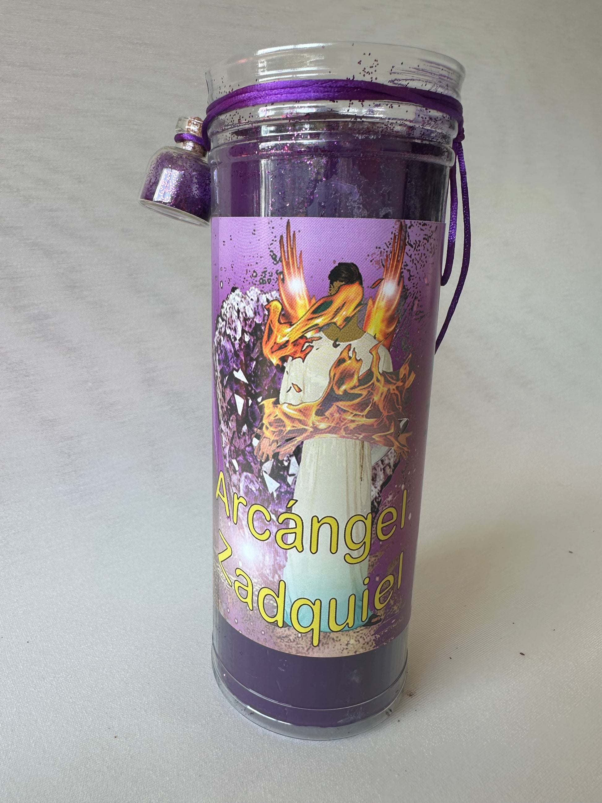 Cada velón del Arcángel Zadkiel incluye un pequeño frasco “Suspiro de Arcángel” y una oración consagrada para invocar su energía purificadora.