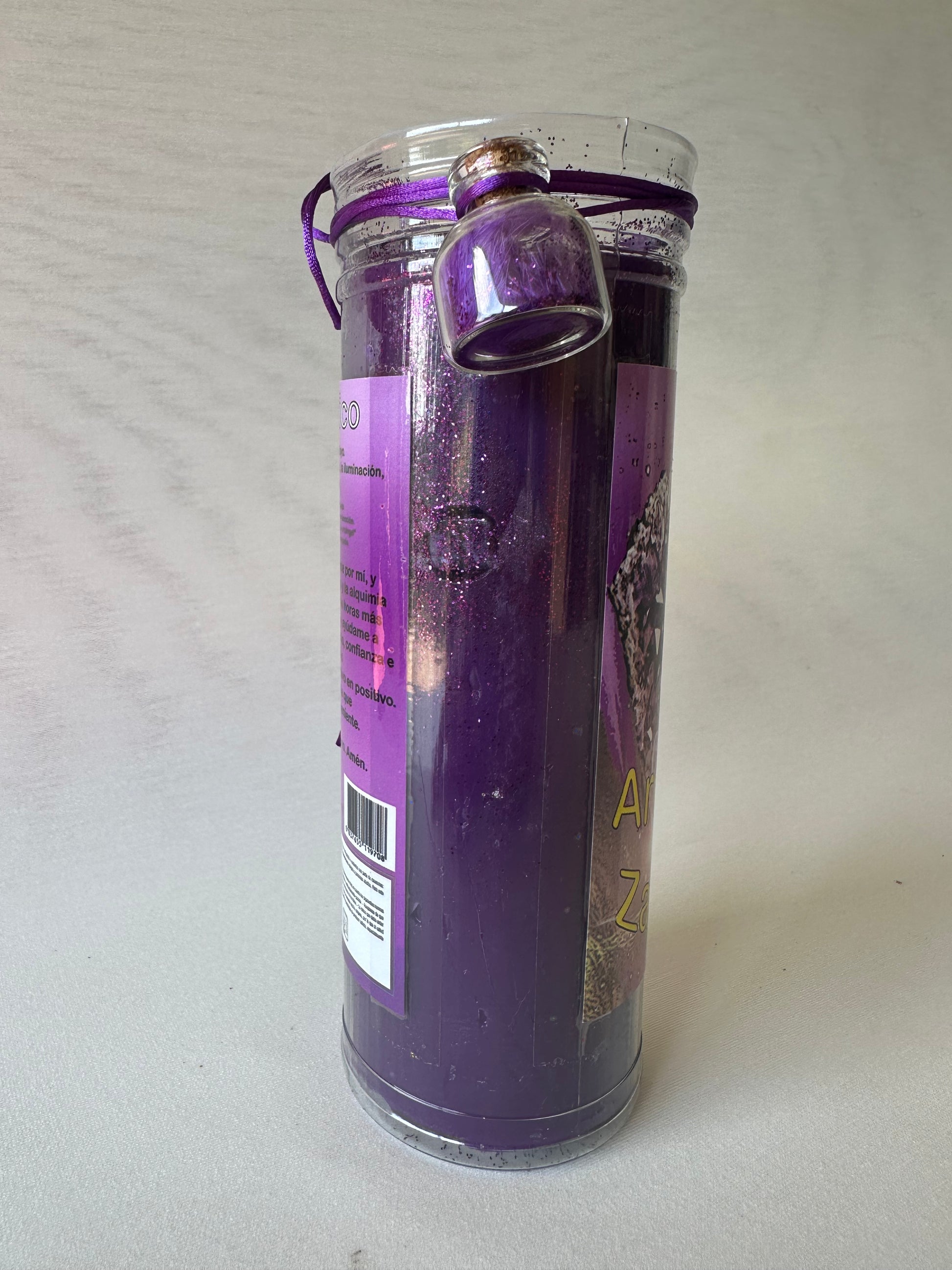 Una vez enciendas el velón con la oración incluida, puedes llevar contigo el frasco como amuleto o colocarlo en tu hogar, negocio o altar para mantener activa su vibración de luz violeta y transformación.